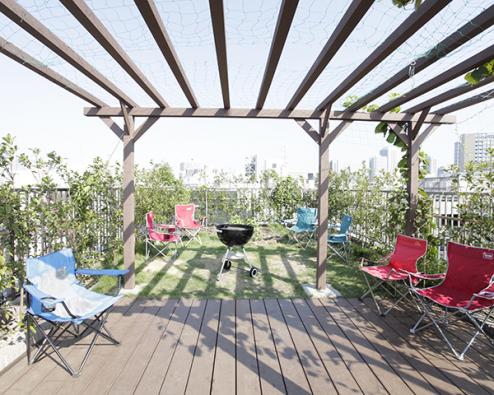 屋上でワイワイBBQが楽しめる、緑とウッドデッキが魅力的な「EDO」